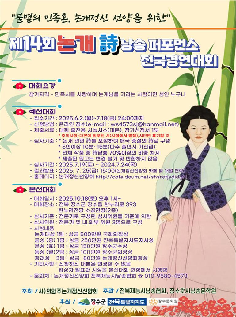 ※ 자세한 사항은 첨부파일 제14회 논개詩낭송 퍼포먼스 전국경연대회 홍보물을 참고 하시기 바랍니다.